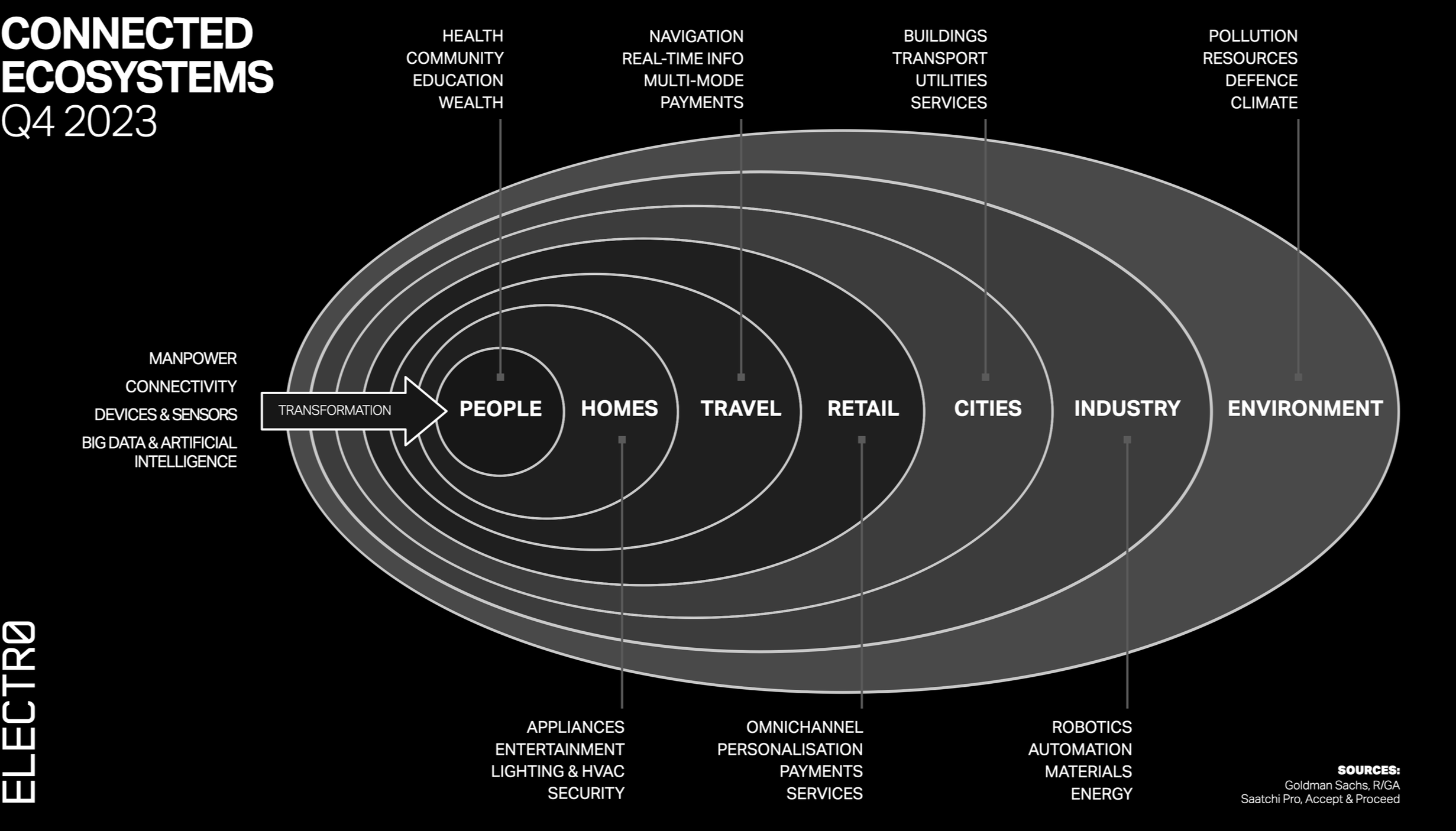 This article presents an update to a framework that has been evolving since 2016, based on an original sketch by Goldman Sachs that has been lost in the mists of USB drives. Over the years, it’s been used practically in workshops to explore strategic questions about connected living with Unilever, smart cities with Visa, and Net Zero with Envision Group. Fire up that projector, grab your Post-It notes and a box of Sharpies.